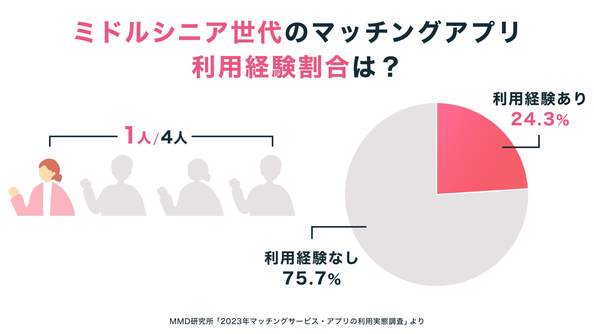近年、ミドルシニア層のスマホ保有率が急増(※1)したことに加え、世の中におけるマッチングアプリ利用(※2)が一般化。2023年のMMD研究所の調査(※3)によれば、40〜60代のマッチングアプリの利用経験は24.3%(40代=33.4%、50代=19.3%、60代=13.1%)と、盛り上がりを見せています。
