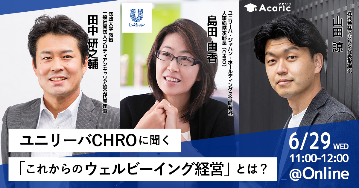 大学院生・研究者のキャリア支援を行っている株式会社アカリク(本社:東京都渋谷区、代表取締役:山田 諒、以下「弊社」)は、ユニリーバ・ジャパン・ホールディングス合同会社 人事総務本部長 島田氏と弊社顧問である法政大学教授 田中氏をゲストにお迎えし、『ユニリーバCHROに聞く「これからのウェルビーイング経営」とは?』と題した「これからのウェルビーイング経営」に関するウェビナーを開催いたします。