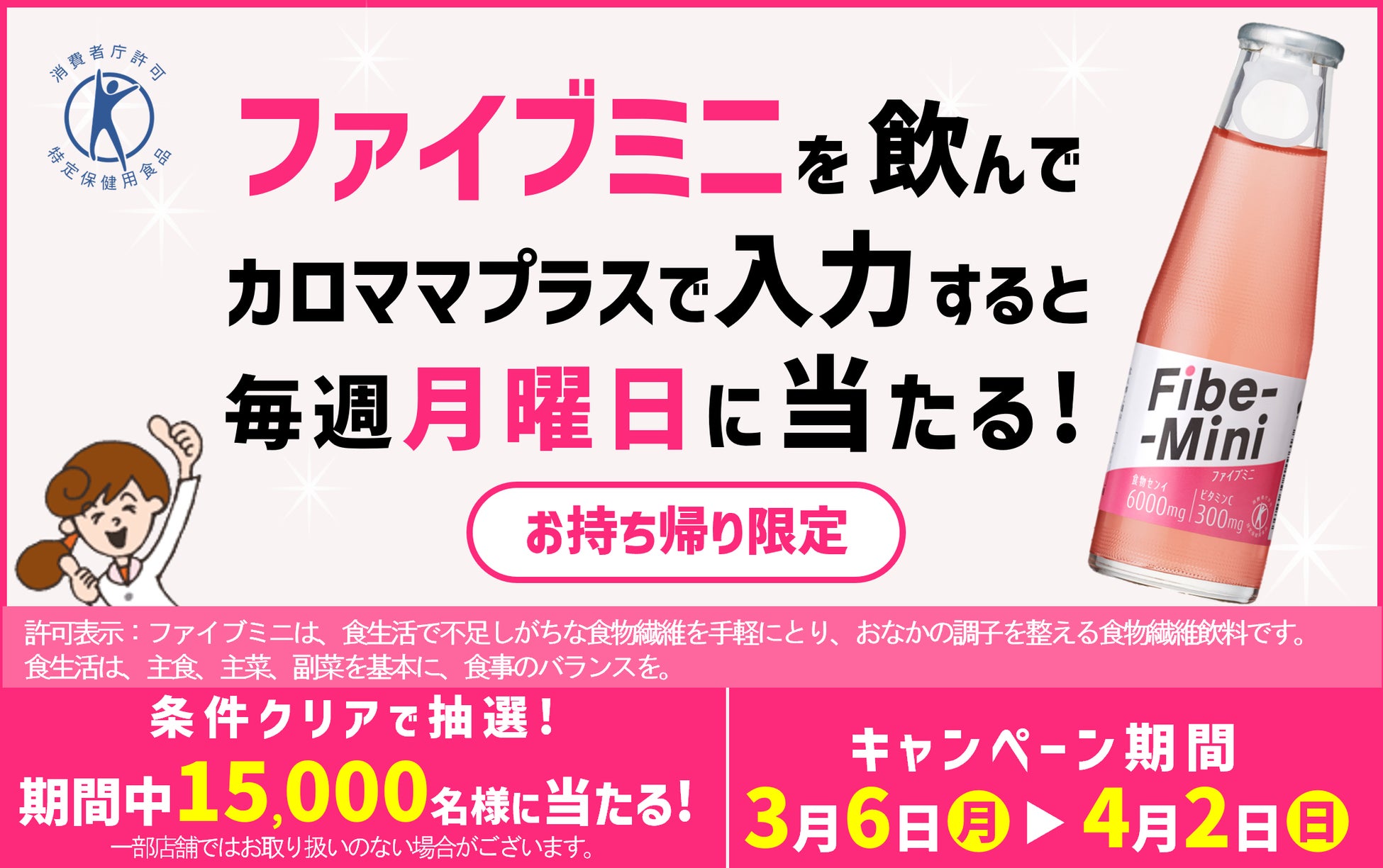AI健康アプリを開発・運営するヘルステック企業である株式会社リンクアンドコミュニケーション(本社:東京都千代田区、代表取締役社長:渡辺 敏成、以下「当社」)は、株式会社ローソン(本社:東京都品川区、代表取締役 社長:竹増 貞信、以下「ローソン」)と合同で、条件を達成した方を対象に抽選で合計15,000名様に特定保健用食品の食物センイ飲料「Fibe Mini(以下、「ファイブミニ」)と引き換えできる無料クーポンをプレゼントするキャンペーンを開催します。日頃不足しがちな食物繊維を手軽にとれる「ファイブミニ」とAI健康アプリ「カロママ プラス」を組み合わせた本キャンペーンを通じて、皆様の健康に貢献いたします。