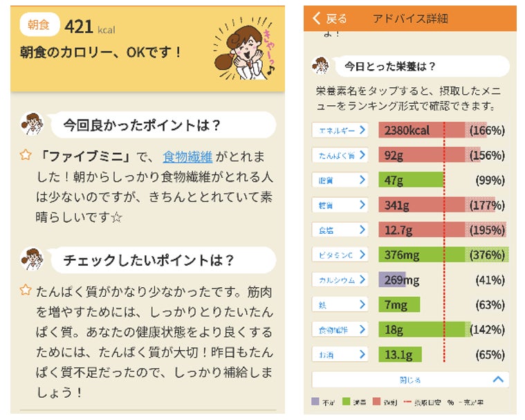 また、1日のおわりには「今日のまとめ」のアドバイスや摂取した栄養素をグラフで確認できます。「今日は食物繊維、足りていたかな?」などのチェックにご活用いただけます。