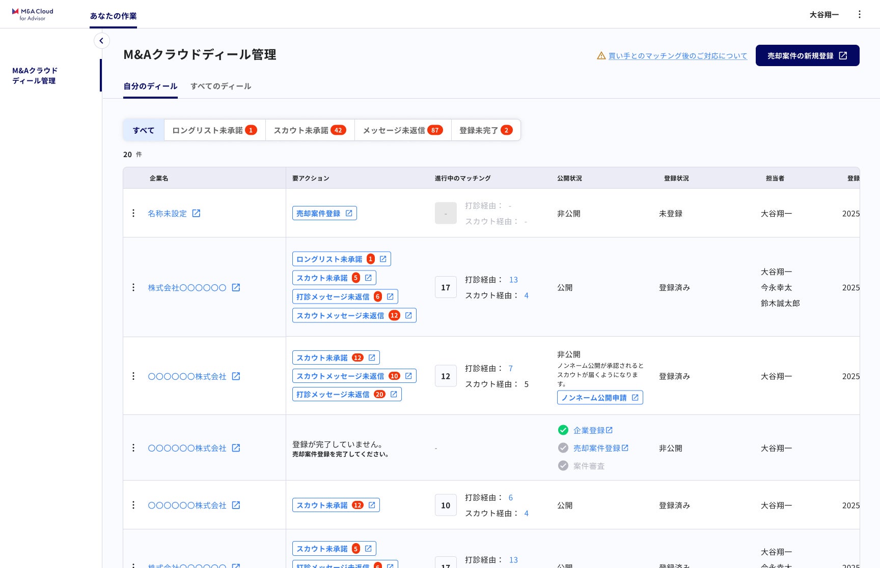 株式会社M&Aクラウド(本社:東京都千代田区、代表取締役CEO:及川厚博、以下「当社」)が運営する、“買い手の顔が見える”求人広告型M&Aマッチングプラットフォーム「M&Aクラウド」は、仲介・売り手FA事業者向け新サービス「M&Aクラウド for アドバイザー」をリリースしました。新機能「管理機能」の追加により、各アドバイザーが担当する案件の進捗をチーム内で即時共有可能、進捗共有漏れや機会損失を最小化にとどめます。