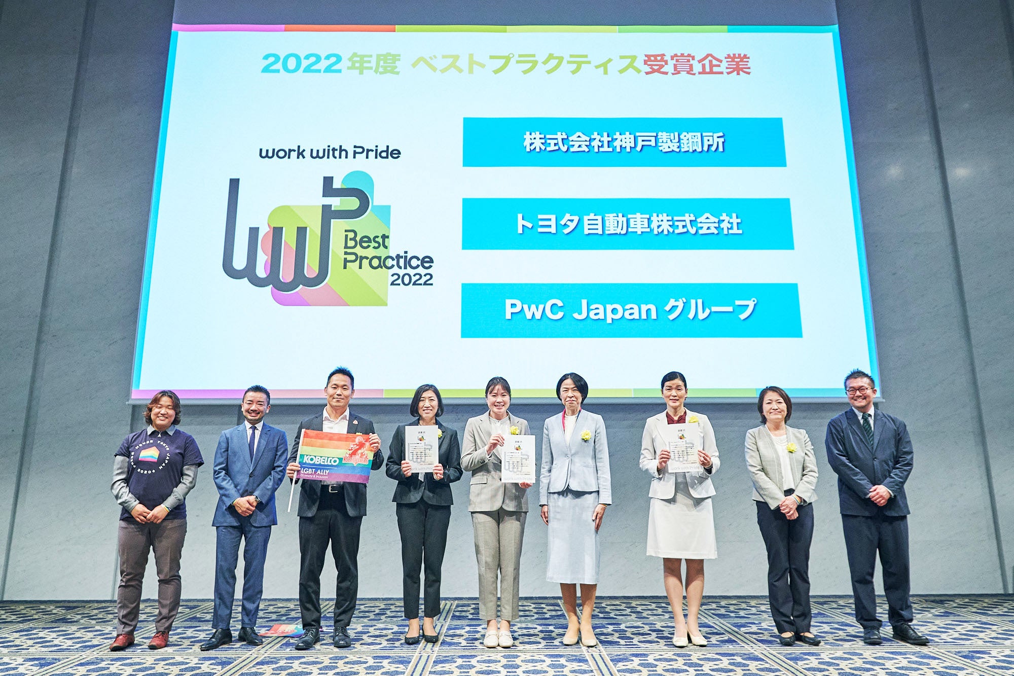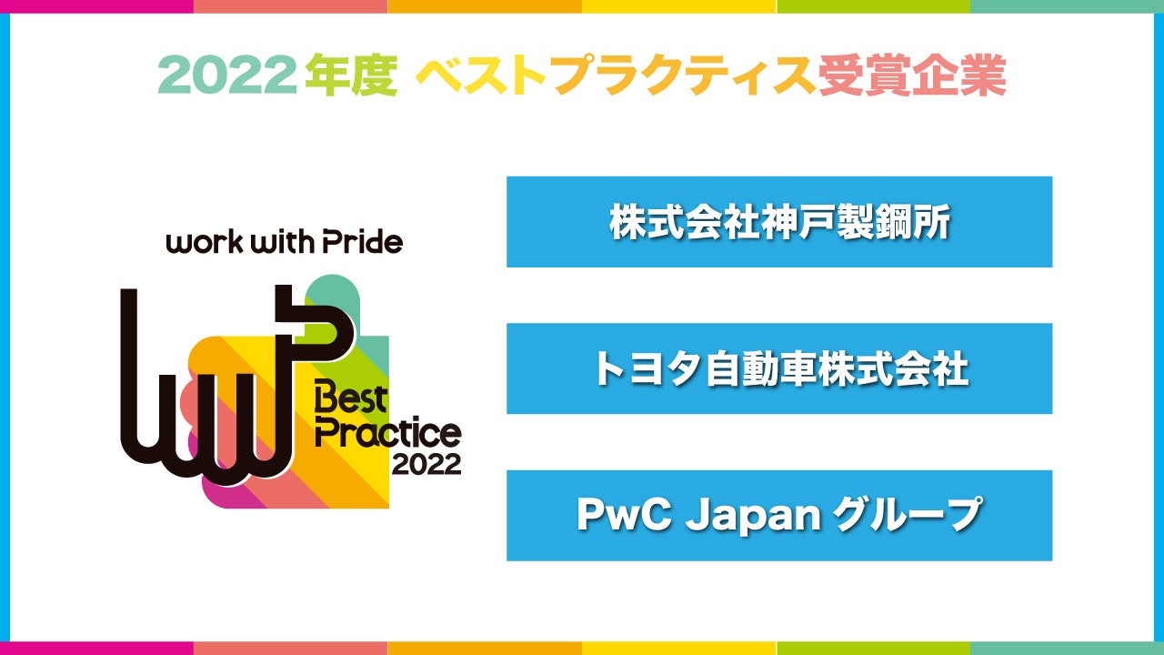 LGBTQ+に対する新たな取り組みやアイデアなどを評価するベストプラクティスでは、株式会社 神戸製鋼所『自社ラグビー部(コベルコ神戸スティーラーズ)の試合での来場者向け啓発活動』、トヨタ自動車 株式会社『豊田市と連携し、自社女子ソフトボール部公式試合において、レインボーマッチを開催』、PwC Japanグループ『自社健康保険組合における「トランスジェンダー対応のある健診機関」該当基準の策定、レインボーマーク付与の提携医療機関を拡充』の3つの取組が受賞しました。