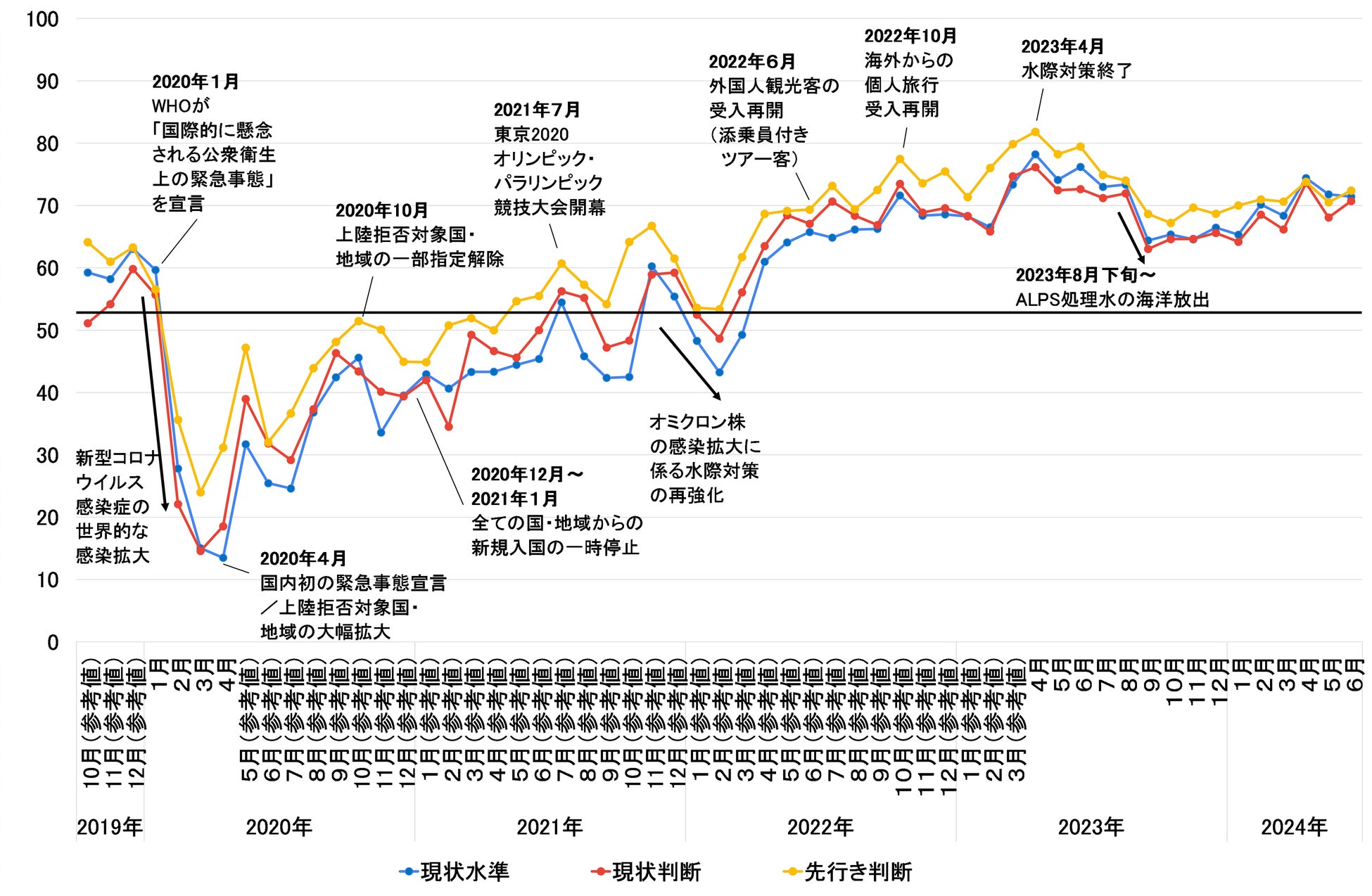 入国制限や制限解除により指数は上下を繰り返し、東京2020オリンピック・パラリンピック競技大会が開幕した2021年7月には、指数は3系列とも50以上となりました。