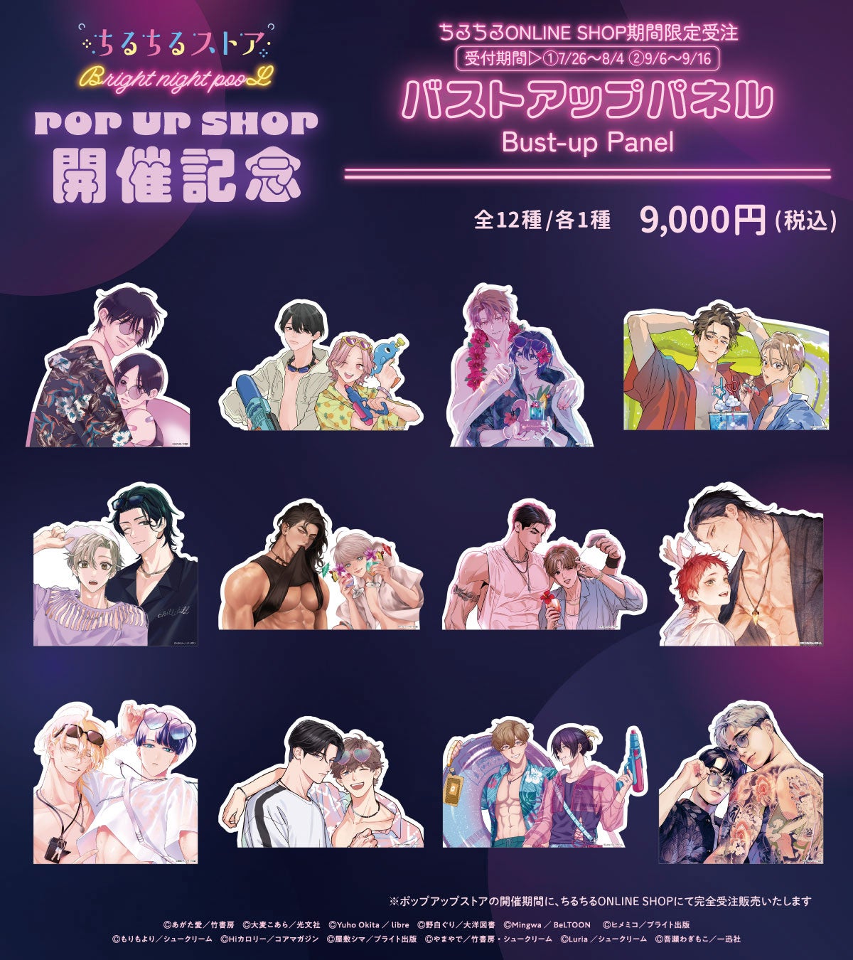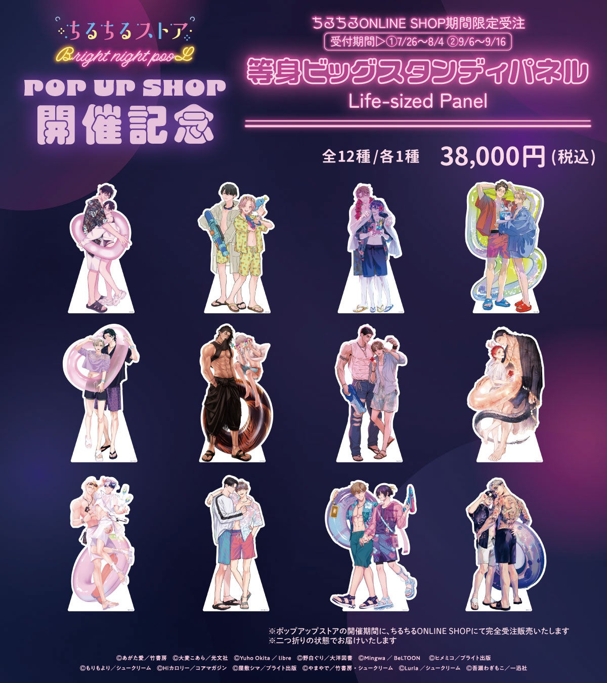 さらに、ポップアップストア開催を記念して、描き下ろしイラストの「等身ビッグスタンディパネル」および「バストアップパネル」の販売も決定! ちるちる ONLINE SHOPにて、ポップアップストア開催期間中に完全受注販売いたします。商品サンプルは会場にて展示予定!お好きなキャラクターたちをぜひご自宅にお招きください。