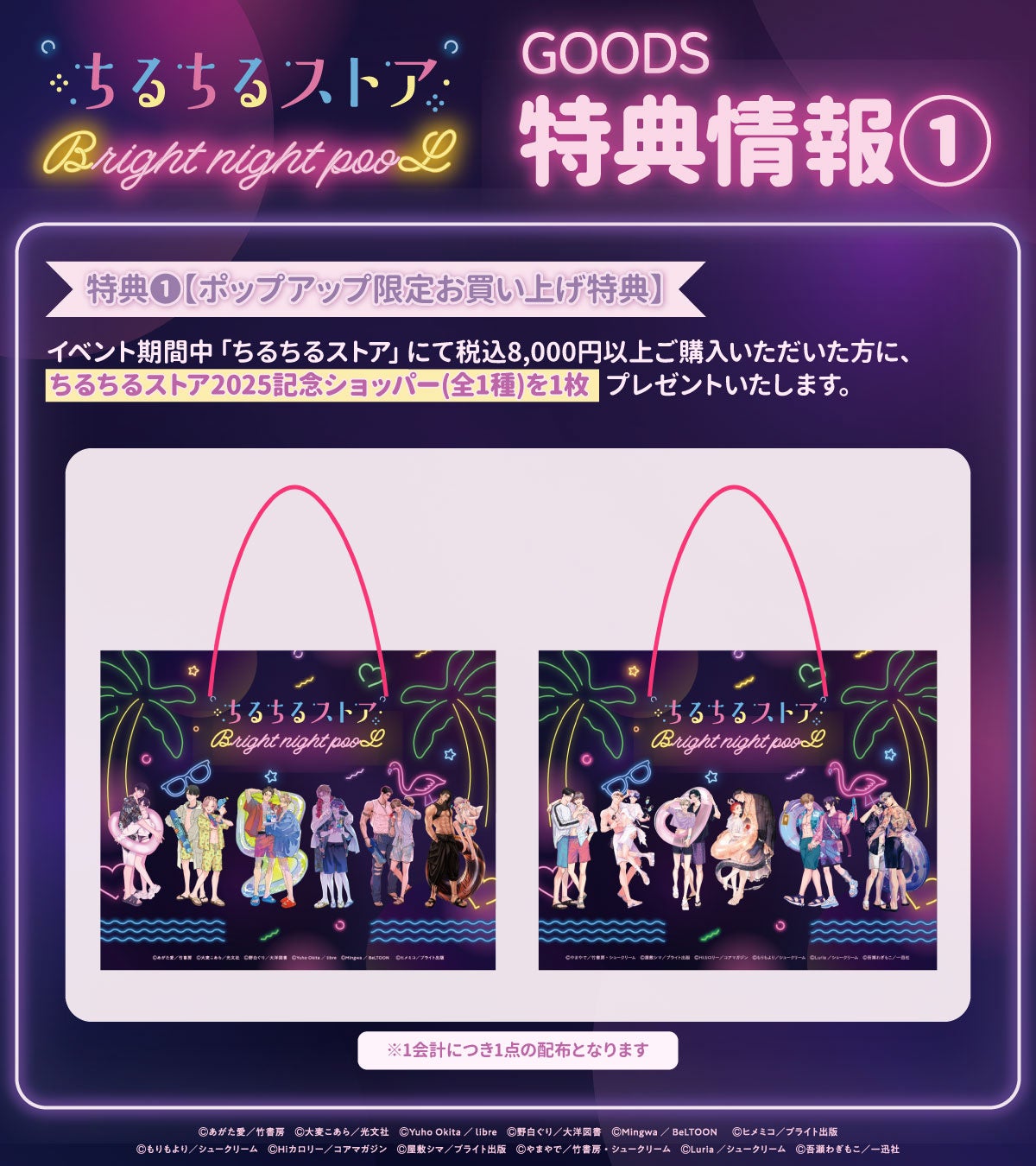 特典はチェキ風カードに加え、ポップアップストア限定特典として、全12作品分の描き下ろしイラストをあしらった「ちるちるストア2025記念ショッパー」をご用意!税込8,000円以上お買い上げいただいた方に1つプレゼントいたします。会場でしか手に入らない貴重な特典をぜひお見逃しなく。