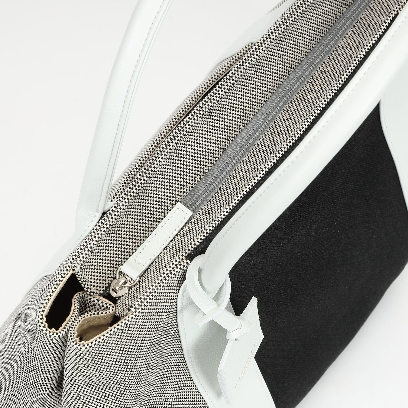 リサイクル(GRS認証)糸を使用し、染色における水の使用も削減している他、ハンドル部分には日本製の高耐久人工皮革「FUMITEX®(フミテックス)」を採用。