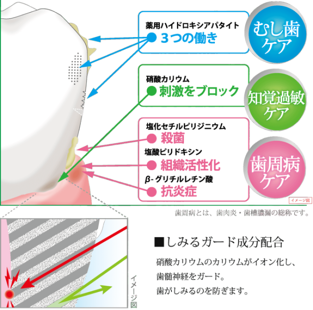 歯がしみるのを防ぐ・歯を白くする・むし歯の発生及び進行の予防・歯肉炎の予防・歯槽膿漏の予防・口臭の防止・口内を浄化する・口内を爽快にする・タバコのヤニ除去