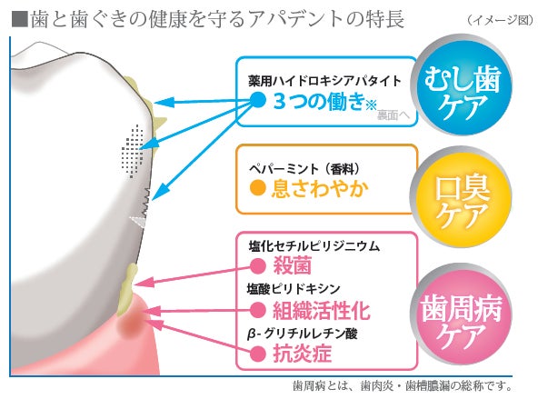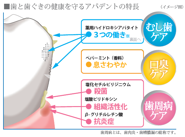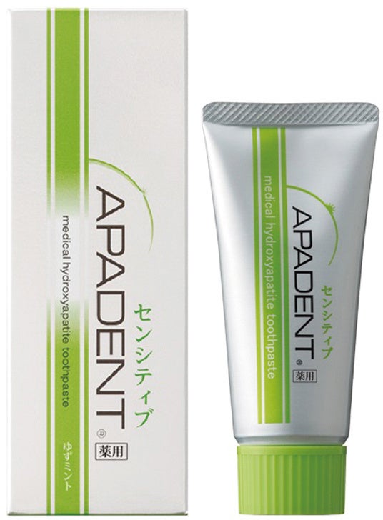 アパデントは、サンギが開発した世界初の薬用ハイドロキシアパタイト配合の歯みがき剤です。無重力の環境下で、宇宙飛行士の歯や骨を守るために研究されていたNASAの技術をヒントに開発しました。歯とほぼ同じ成分※である薬用ハイドロキシアパタイトが歯から失われたミネラルを補給してエナメル質を整え、むし歯を予防。むし歯・歯周病(歯肉炎・歯周炎の総称)・口臭を予防し、歯と歯ぐきの健康をトータルにサポートします。