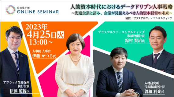 アフラック生命保険 人事執行役員やプラスアルファ・コンサルティング 取締役副社長の鈴村などが登壇!『人的資本時代におけるデータドリブン人事戦略を考える』開催決定 【2023年4月25日(火)】