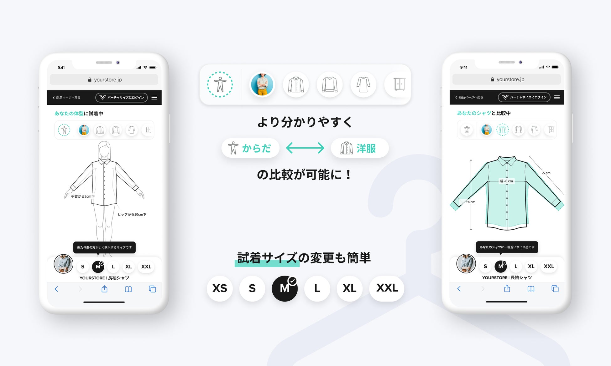 バーチャサイズは、ECサイト上におけるアイテム同士の比較だけでなく、簡単なデータ入力で生成されるユーザーごとにパーソナライズ化されたシルエットとの比較も可能な、既存のサービスとは異なる視点でのサイズ比較ソリューションを提供しています。当社は、ユーザーのサイズの悩みを解決し、安心したオンラインショッピングを提供できるよう、日々アップデートを重ねています。