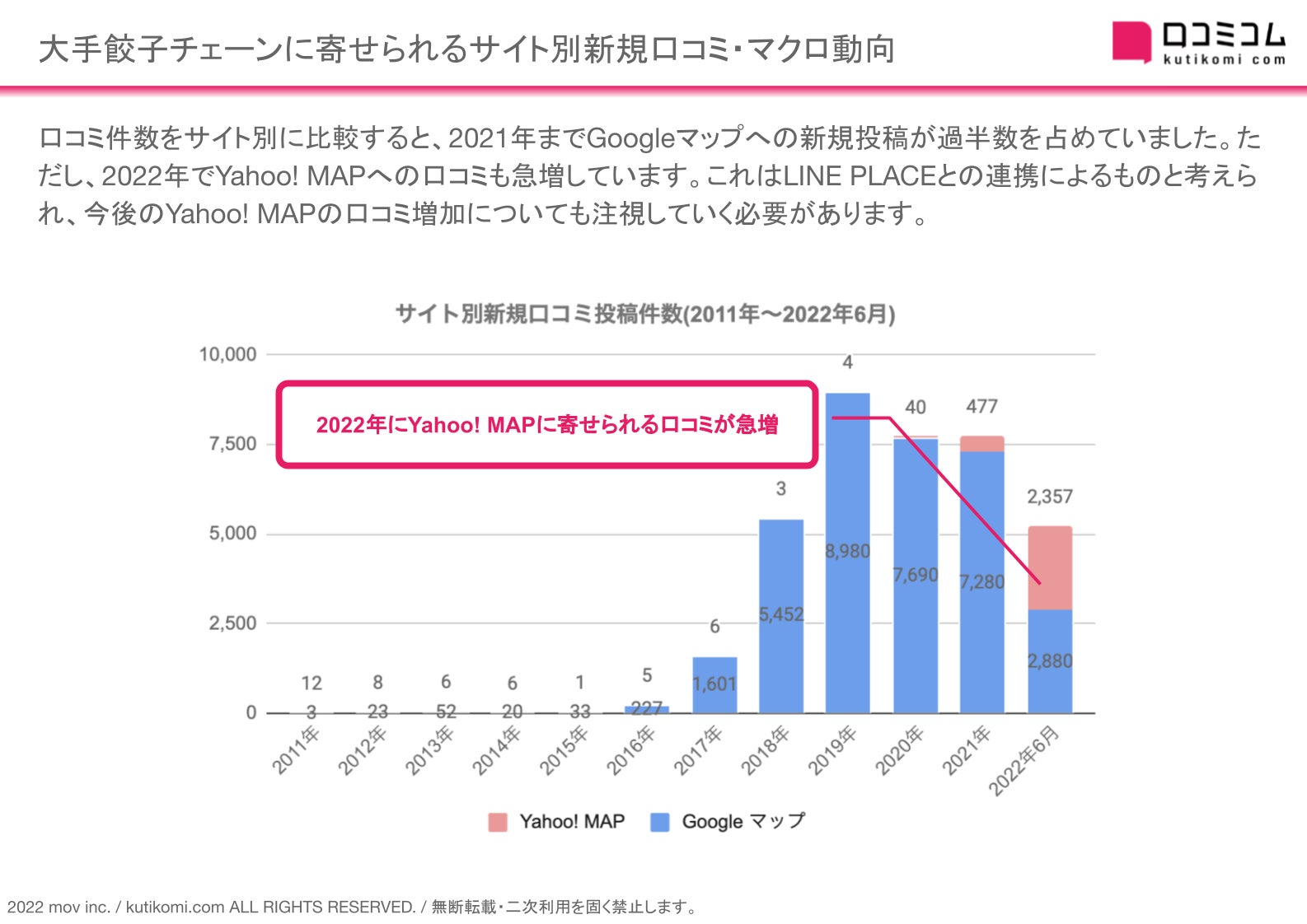 口コミ件数をサイト別に比較すると、2021年までGoogleマップへの新規投稿が過半数を占めていました。ただし、2022年でYahoo! MAPへの口コミも急増しています。これはLINE PLACEとの連携によるものと考えられ、今後のYahoo! MAPの口コミ増加についても注視していく必要があります。