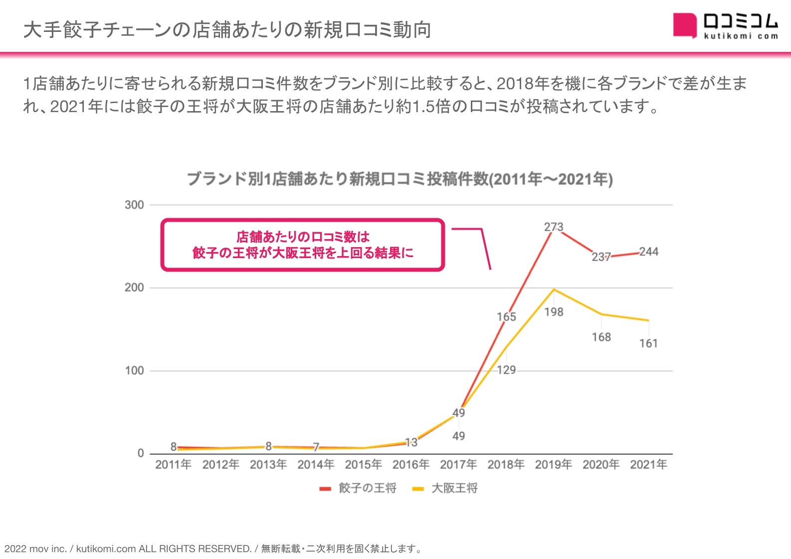 1店舗あたりに寄せられる新規口コミ件数をブランド別に比較すると、2018年を機に各ブランドで差が生まれ、2021年には餃子の王将が大阪王将の店舗あたり約1.5倍の口コミが投稿されています。