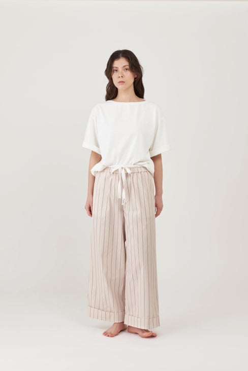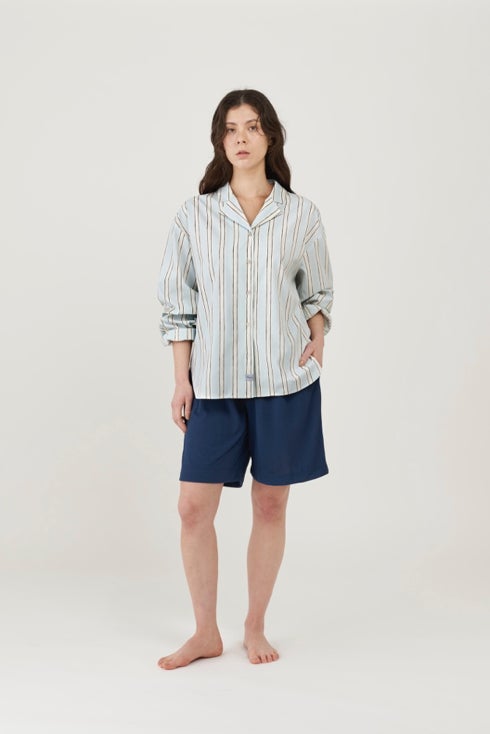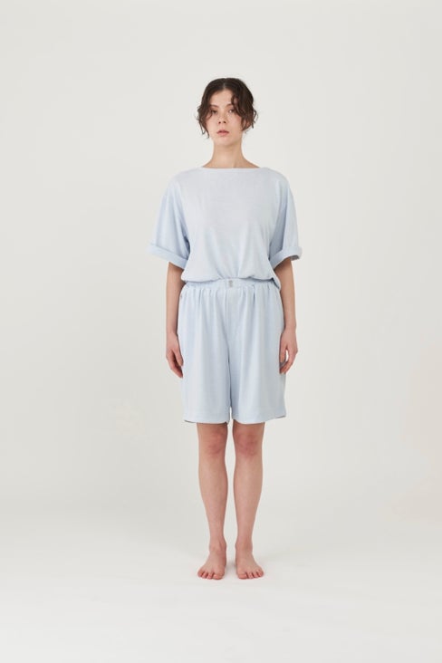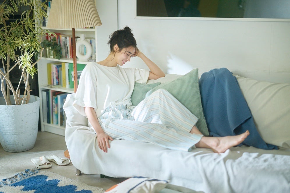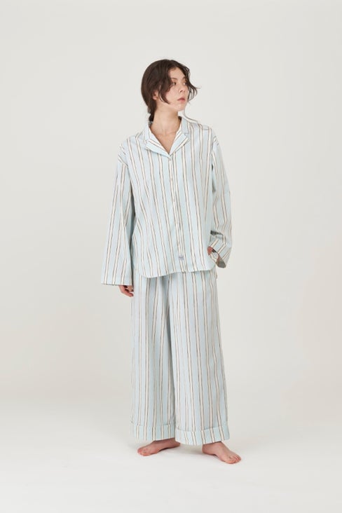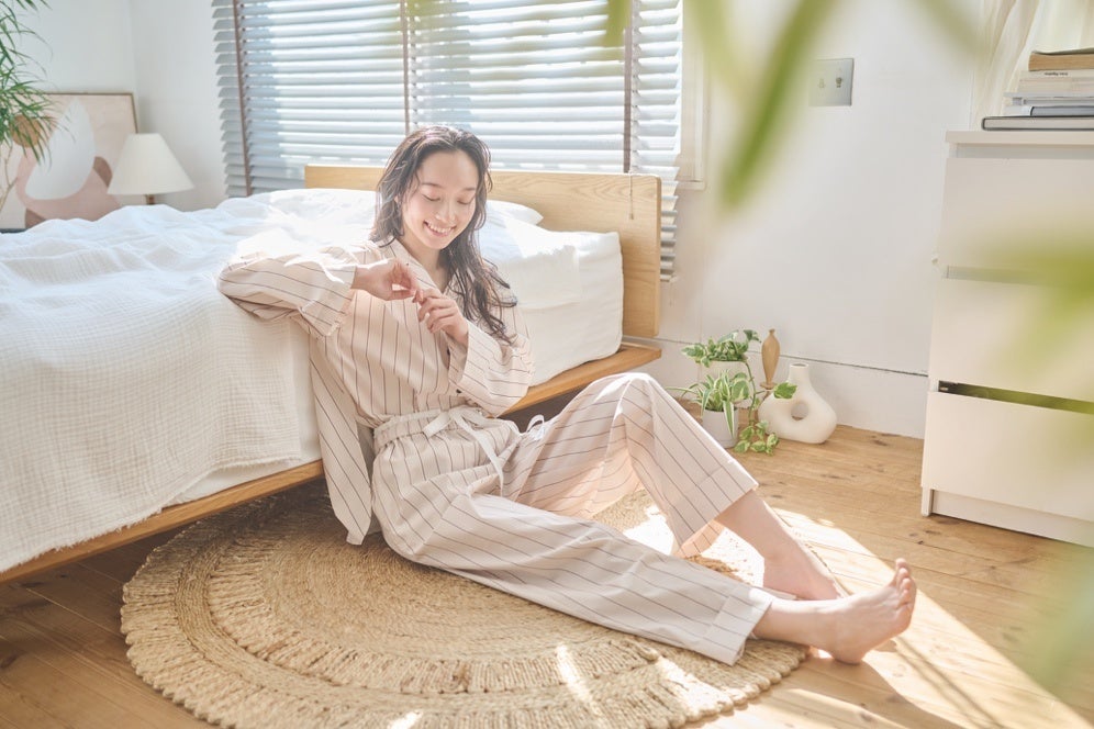 日常をシームレスに繋ぐセットアップ:上下を自由に組み合わせられるカラーバリエーションを展開。寝室からそのまま外出もできる洗練された佇まいは、着替えの手間を省くだけでなく、暮らしのあらゆるシーンで心を弾ませます。