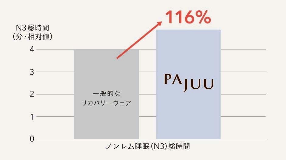 汗をかきやすい環境下における着用比較試験において、最も深い睡眠段階である『ノンレム睡眠(N3)』の総時間が、一般的なリカバリーウェアと比較して116%という結果が確認されました。