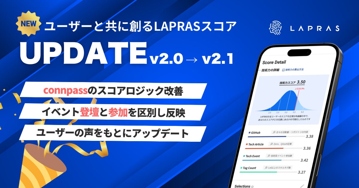 LAPRAS株式会社(所在地:東京都渋谷区、代表取締役:染谷健太郎 以下、LAPRAS社)は、ITエンジニアのスキルを可視化する「LAPRASスコア」をアップデートし、バージョン2.1をリリースしました。LAPRASスコアは、バージョン2.0より「ユーザーとともに作るスコア」へと進化しており、今回、ユーザーの声を受けてバージョン2.0以降初めてのバージョンアップを実施しました。本アップデートでは、主にTech Eventスコアの算出ロジックを改善しました。