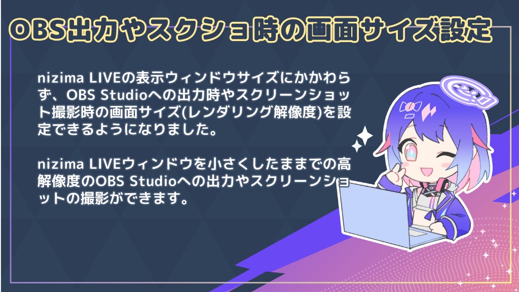 nizima LIVEの表示ウィンドウサイズにかかわらず、OBS Studioへの出力時やスクリーンショット撮影時の画面サイズ(レンダリング解像度)を設定できるようになりました。