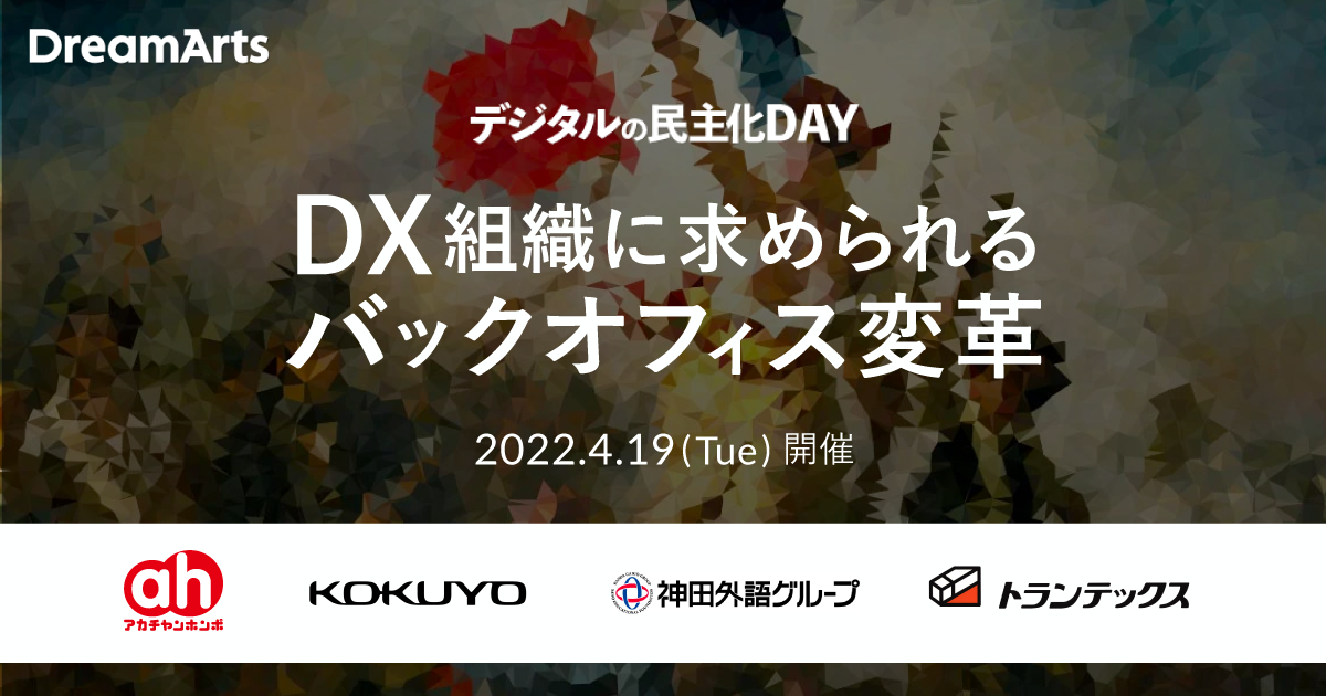 「デジタルの民主化」のリーディングカンパニー 株式会社ドリーム・アーツ(東京本社:東京都渋谷区、広島本社:広島県広島市、代表取締役社長:山本 孝昭、以下 ドリーム・アーツ)は、DXやデジタル活用に取り組むビジネスリーダー向けのオンラインイベント「デジタルの民主化DAY」を、2022年4月19日(火)に開催することをお知らせします。 第2回の今回は、DX組織に求められるバックオフィス変革について、業務デジタル化クラウド「SmartDB(R)(スマートデービー)」のユーザー企業をお招きし、「デジタルの民主化(※)」の最新事例をご紹介します。