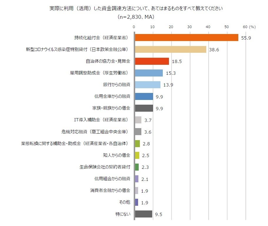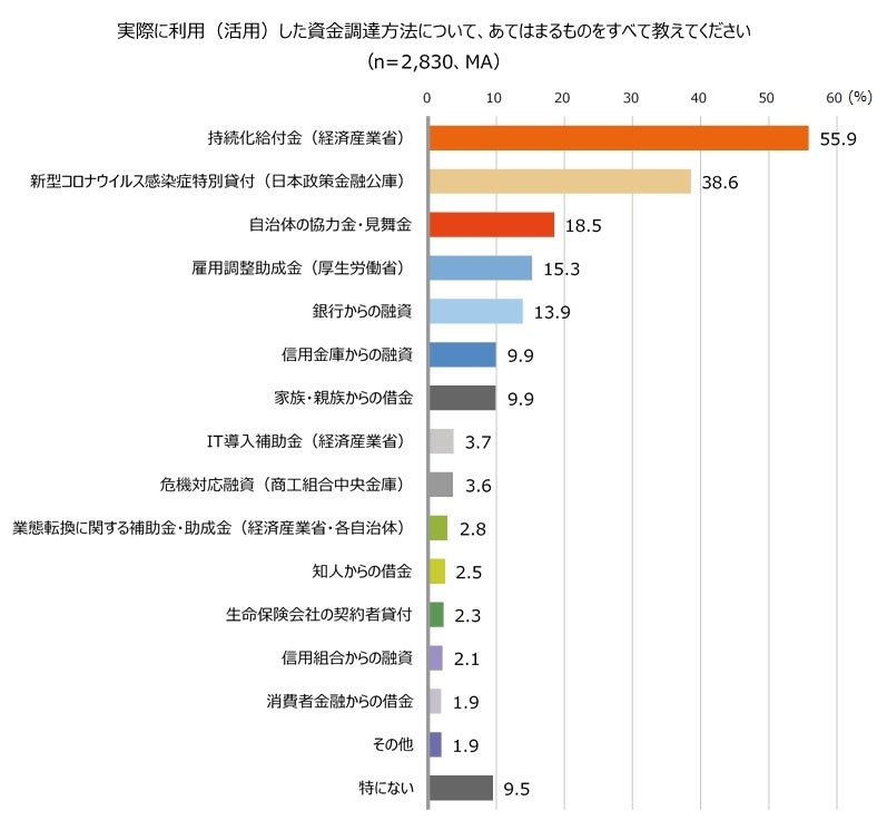 さらに、資金需要が「発生した」と回答した2,830名に、実際に利用(活用)した資金調達方法について聞いたところ、「持続化給付金(経済産業省)」(55.9%)が最も多く、次いで「新型コロナウイルス感染症特別貸付(日本政策金融公庫)」(38.6%)、「自治体の協力金・見舞金」(18.5%)となりました。