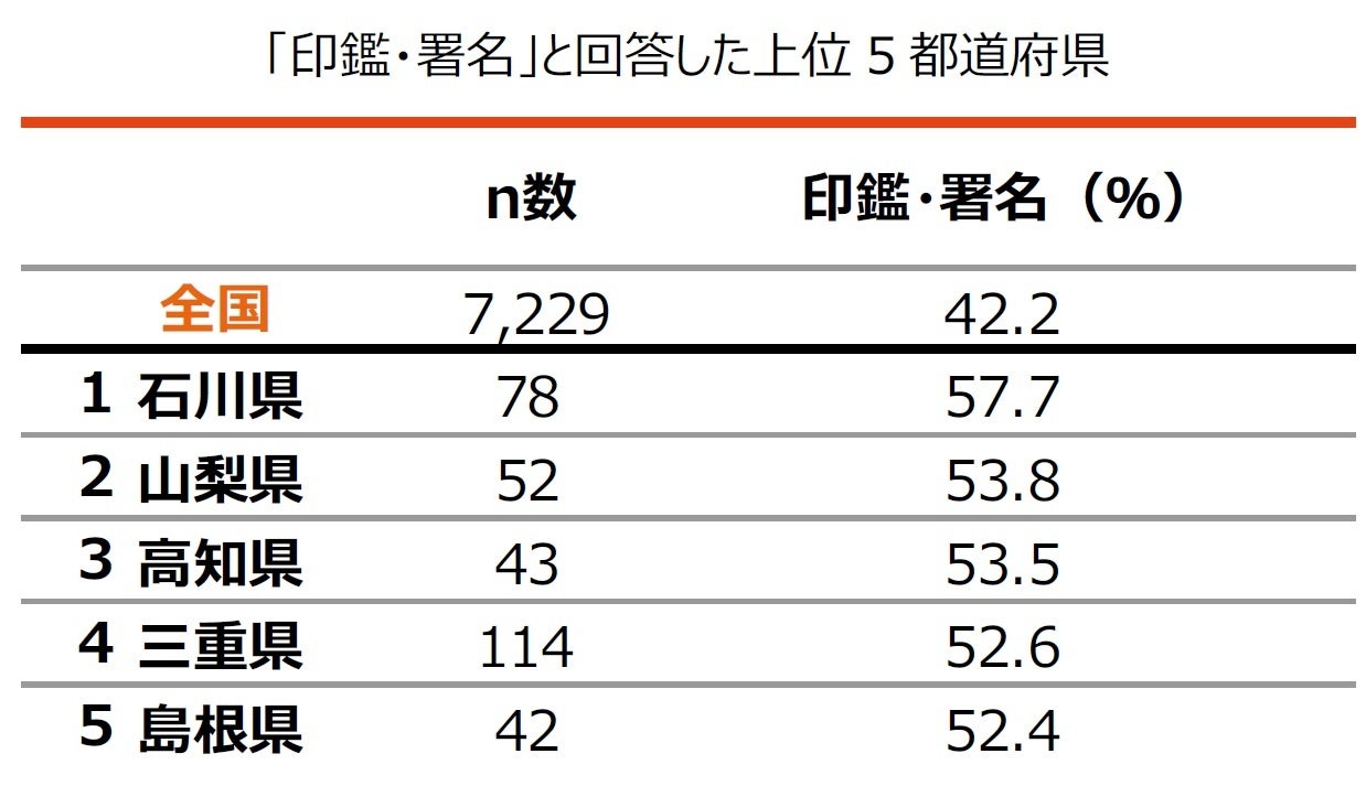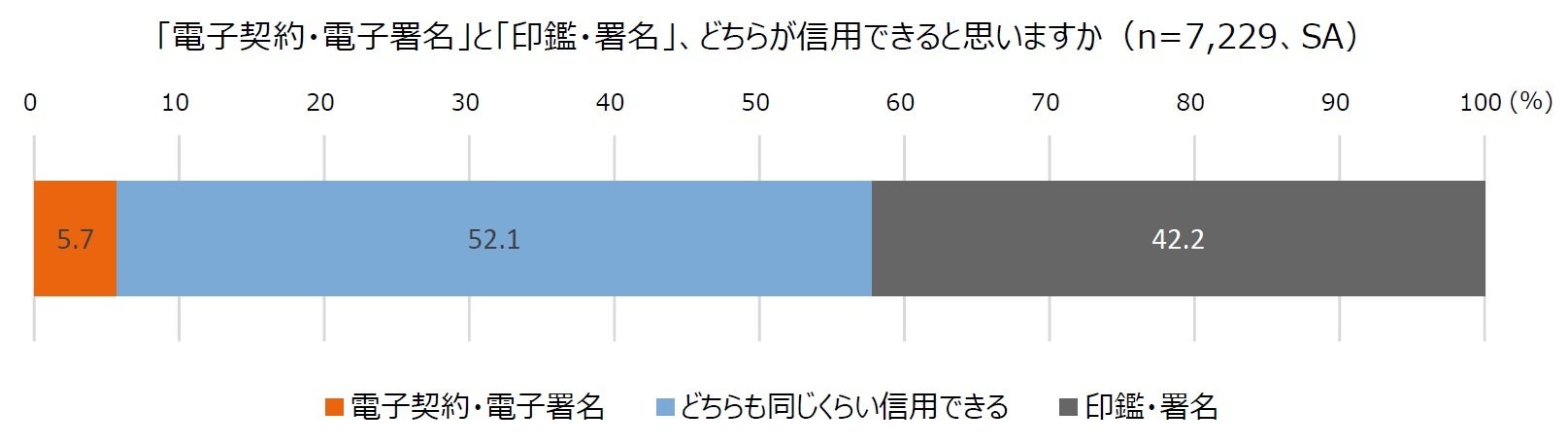 - 「印鑑・署名」と「電子契約・署名」の信頼性について「どちらも同じくらい信頼できる」が過半数(52.1%)の一方、「印鑑・署名」の回答は4割以上(42.2%)