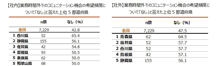 社内の業務時間外コミュニケーションの希望する頻度が「なし」の回答率を都道府県別に見ると、香川県(65.4%)が最も多く、次いで静岡県(56.1%)、佐賀県(54.8%)となりました。また、社外の業務時間外コミュニケーションの希望する頻度が「なし」の回答率を都道府県別にみると、青森県(64.5%)、福井県および香川県(57.7%)となりました。