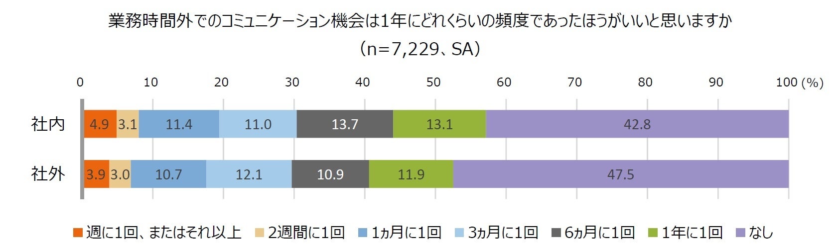 - 業務時間外のコミュニケーションの希望頻度は「なし」が社内(42.8%)、社外(47.5%)とともに最多