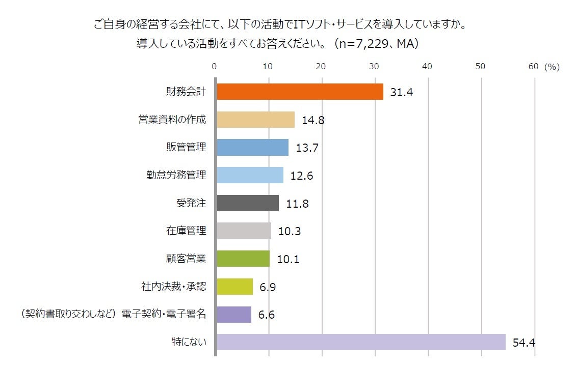 中小企業経営者7,229名にITソフト・サービスを導入している活動を聞いたところ、最も多いのは「財務会計」(31.4%)となり、「営業資料の作成」(14.8%)、「販管管理」(13.7%)と続く結果になりました。一方で、「特にない」が過半数の54.4%となりました。