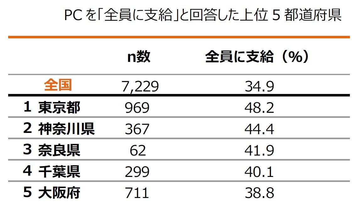 - IT機器の支給状況として、全員に支給されている割合が最も高いのは「PC」が3割(34.9%)の一方、「PCを全く支給していない」が43.0%と社員への支給をしない会社も目立つ