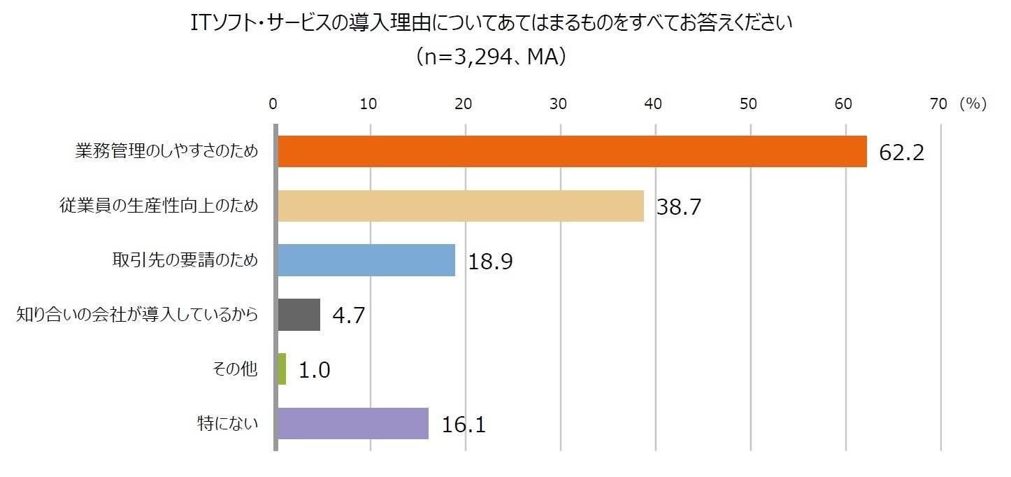 導入していると答えた中小企業経営者3,294名に理由を聞いたところ、「業務管理のしやすさのため」が最も高く(62.2%)、次いで、「従業員の生産性向上のため」(38.7%)、「取引先の要請のため」(18.9%)となりました。