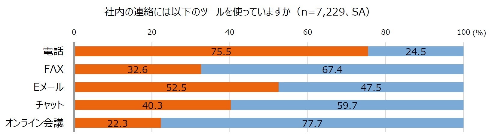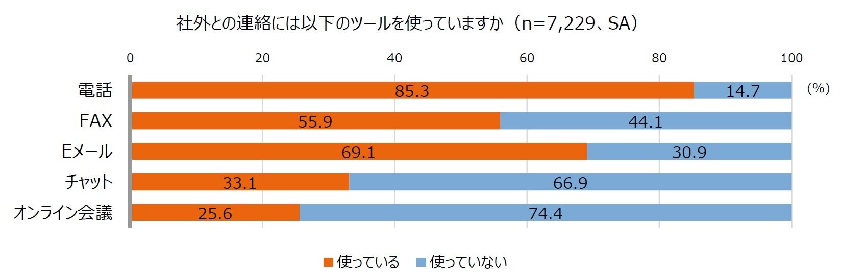 中小企業経営者7,229名に、社内および社外との連絡ツールとして「電話」「FAX」「Eメール」「チャット」「オンライン会議」の利用を聞いたところ、ツールとして最も利用されていたのは、「電話」で、「社内」向けで75.5%、「社外」向け利用で85.3%でした。また、「FAX」(社内:32.6%、社外:55.9%)や、「Eメール」(社内:52.5%、社外:69.1%)、「オンライン会議」(社内:22.3%、社外:25.6%)と多くのツールが社内よりも社外向けに利用されていることが分かりましたが、「チャット」については「社内」(40.3%)、「社外」(33.1%)と社内での連絡に使われていることがうかがえます。