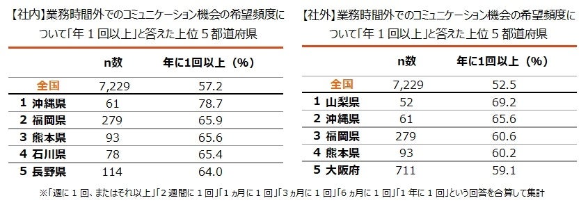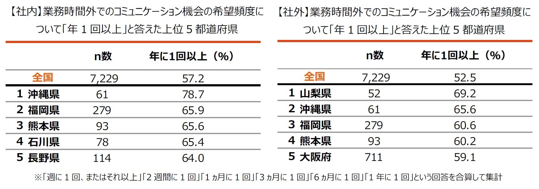 業務時間外コミュニケーションの希望する頻度について、「週に1回、またはそれ以上」「2週間に1回」「1ヵ月に1回」「3ヵ月に1回」「6ヵ月に1回」「1年に1回」のいずれかを回答した、「1年に1回以上実施したい」の回答率を都道府県別にみると、「社内」では、沖縄県(78.7%)が最も高く、「社外」では、山梨県(69.2%)が最も高くなりました。