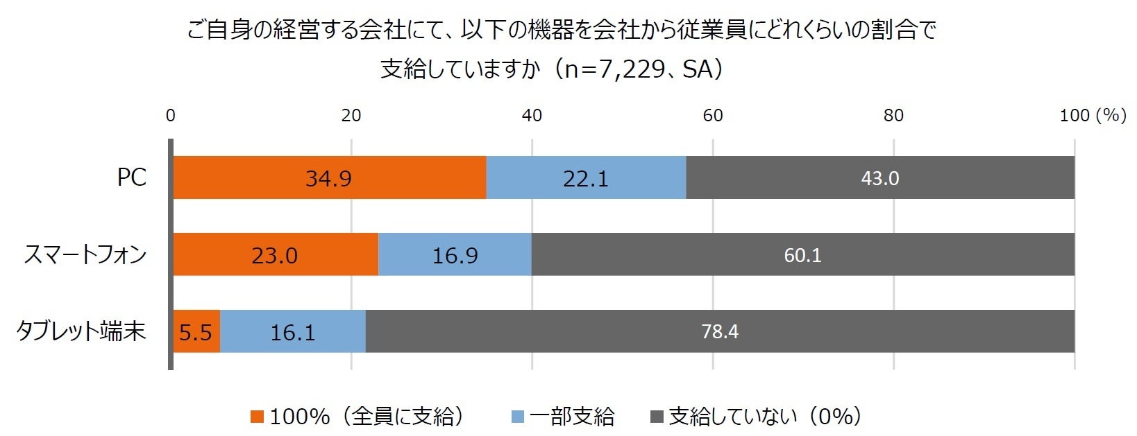 中小企業経営者7,229名に、「PC」「スマートフォン」「タブレット」のIT機器の支給状況を聞いたところ、全員への支給率が最も高いのは、PC(34.9%)となり、一方で、PCを全く支給していないと回答した中小企業経営者が43.0%いることが明らかになりました。