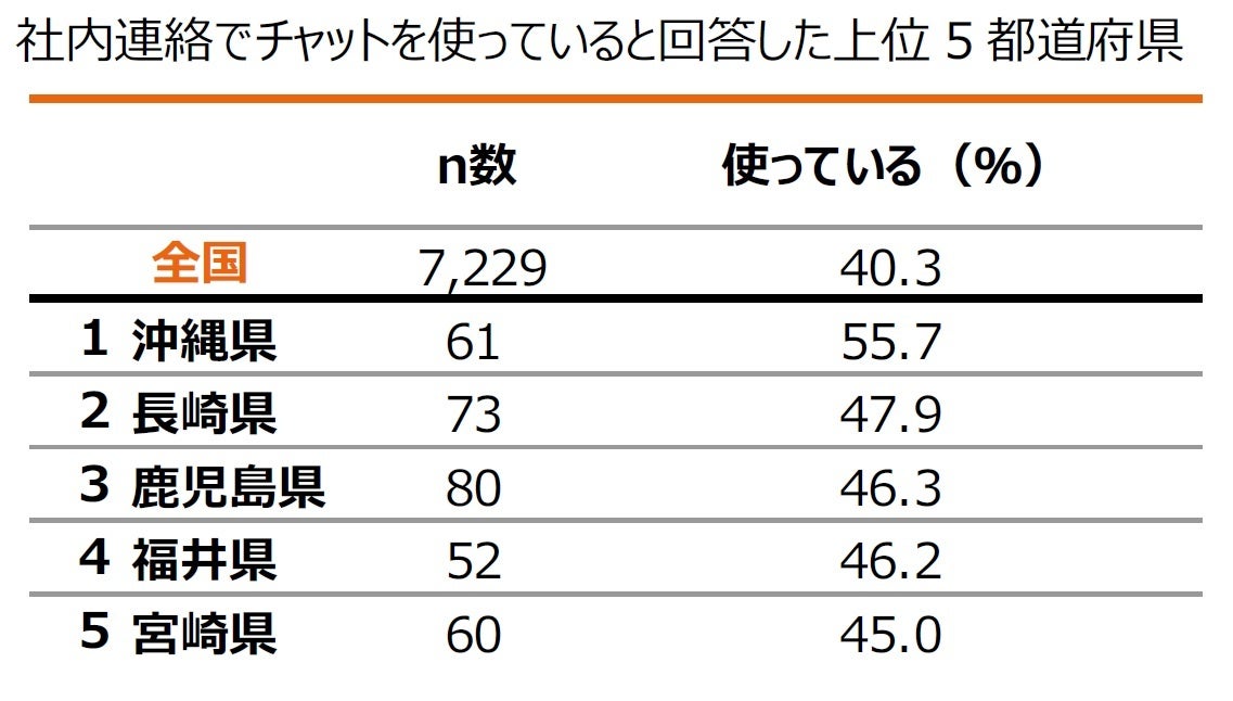 チャットについて「社内連絡で使っている」の回答率を都道府県別に見ると、沖縄県(55.7%)が最も多く、次いで長崎県(47.9%)、鹿児島県(46.3%)となりました。