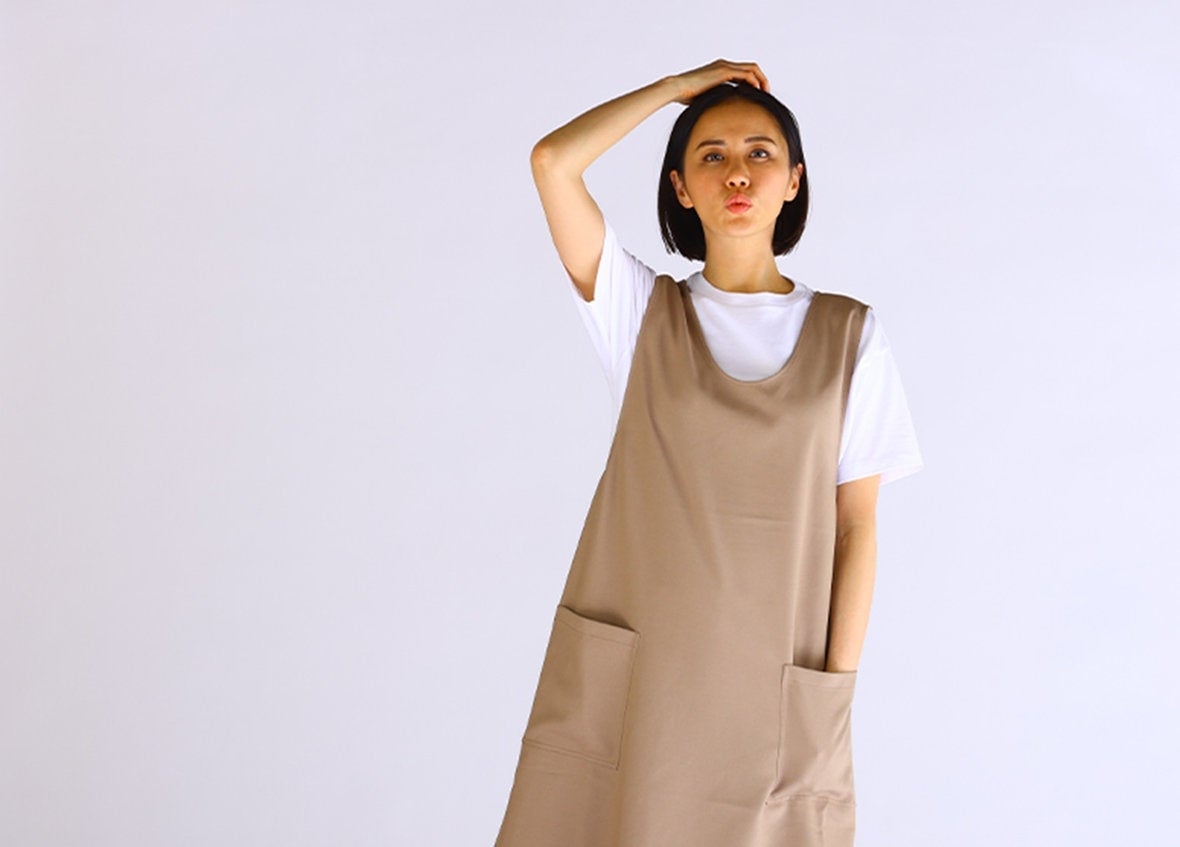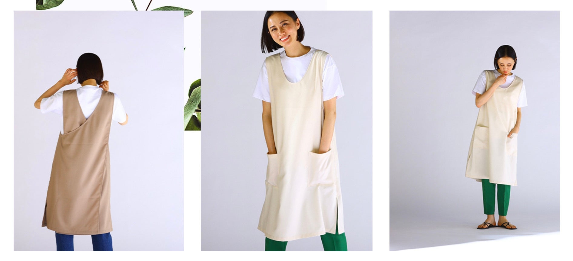 「洋服を汚れから守りたい」「外からのウイルスを防止したい」そんな想いから機能的に優れた日本の伝統着である割烹着を、現代的にリデザインしました。