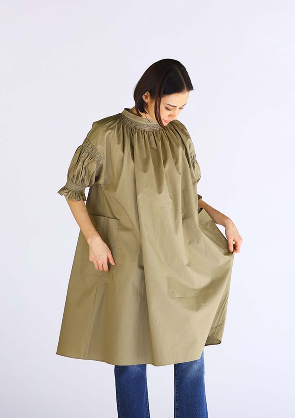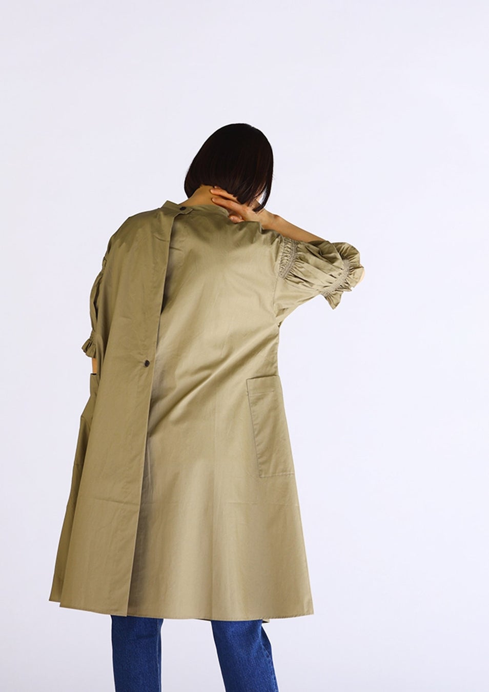 クラシカルな雰囲気漂うスタンドカラーに、ネックや袖などにシャーリングを施しかわいらしさをプラス。