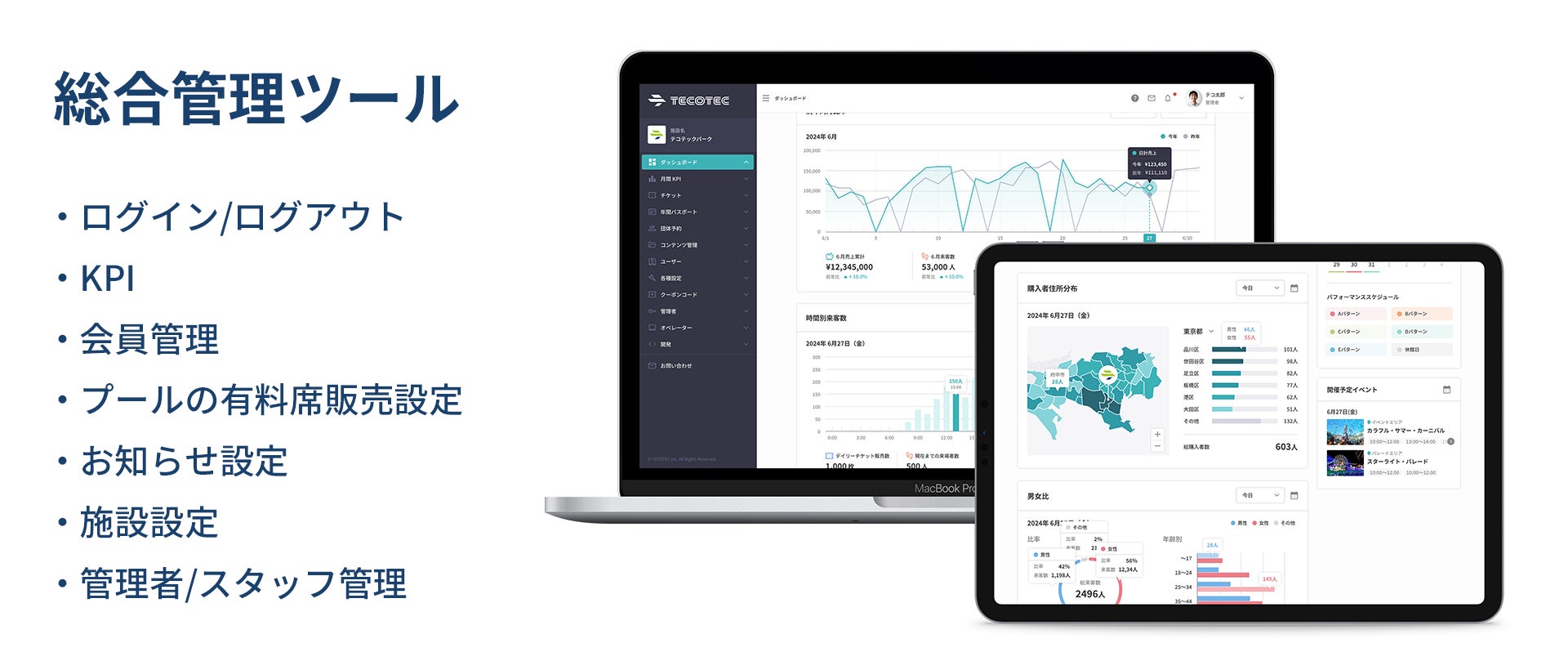さらに、販売状況や売上情報、顧客属性などのデータを可視化する機能も備えており、施設運営における業務の効率化や改善に役立ちます。複雑になりがちな運営データを集約し、管理・分析しやすくすることで、よりスムーズで効果的な施設運営を支援します。
