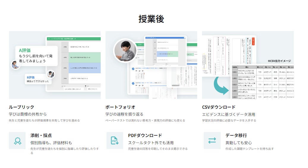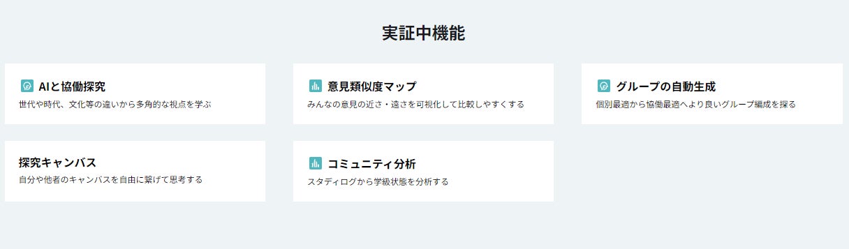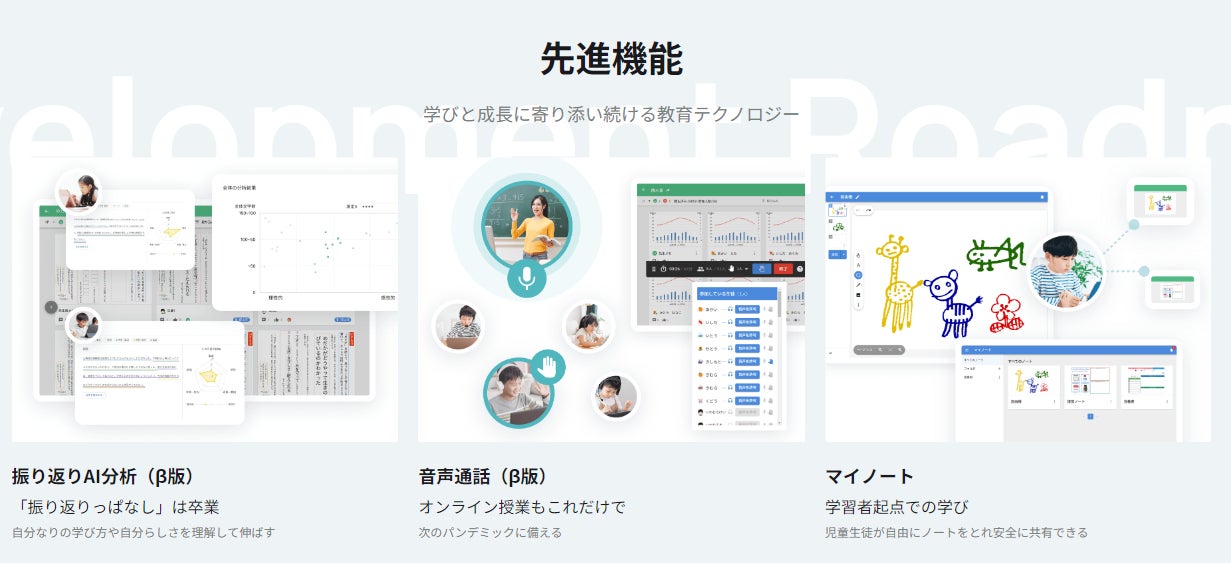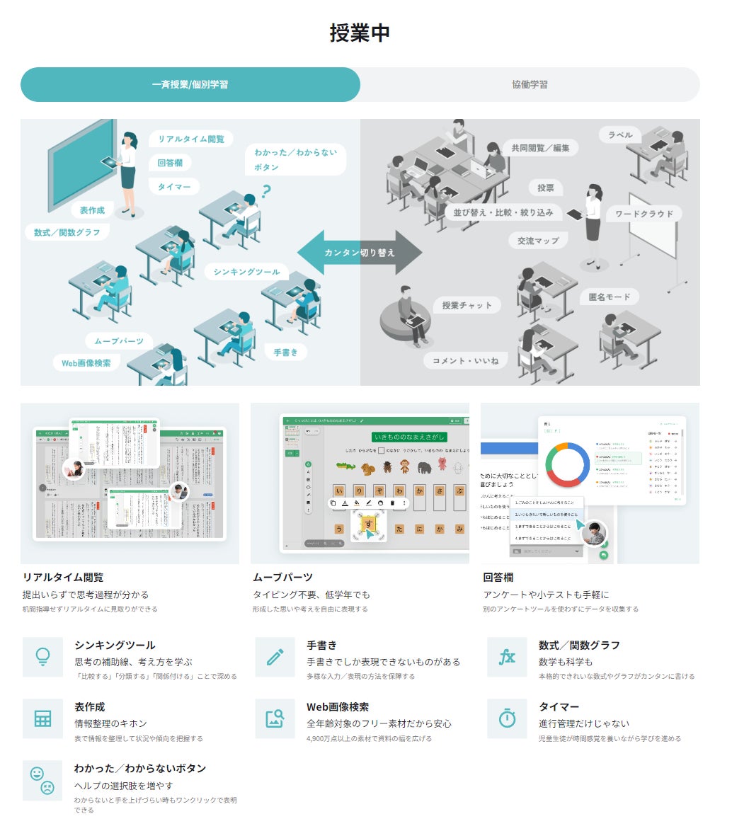 教育場面を想定し開発された便利な機能を、「授業前」「授業中」「授業後」、「一斉授業」「協働学習」など、シーン・スタイル別に紹介しています。また、AIやデータ分析を活用した今後の実装予定機能も公開しており、これらの機能を通じた教育の未来を提示しています。