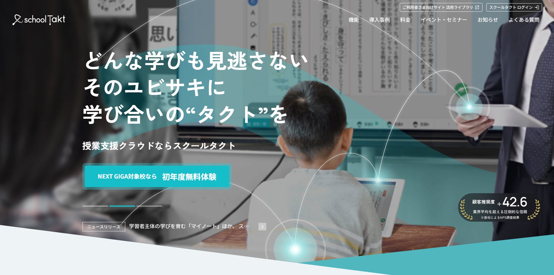 AIやスタディログなどを活用しながら、あらゆる授業で先生と児童生徒同士が指先ひとつでつながり、学び合う教室の風景を、スクールタクトの世界観としてサイトデザインの随所に反映しました。