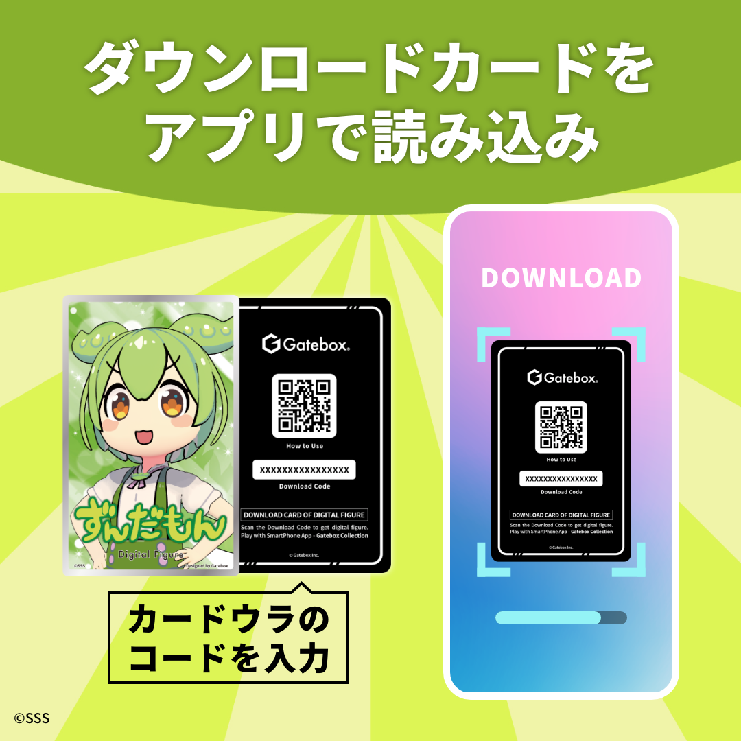 商品に同梱されているダウンロードカードを専用アプリで読み取ると、デジタルフィギュアをダウンロードしてお部屋に飾ることができます。