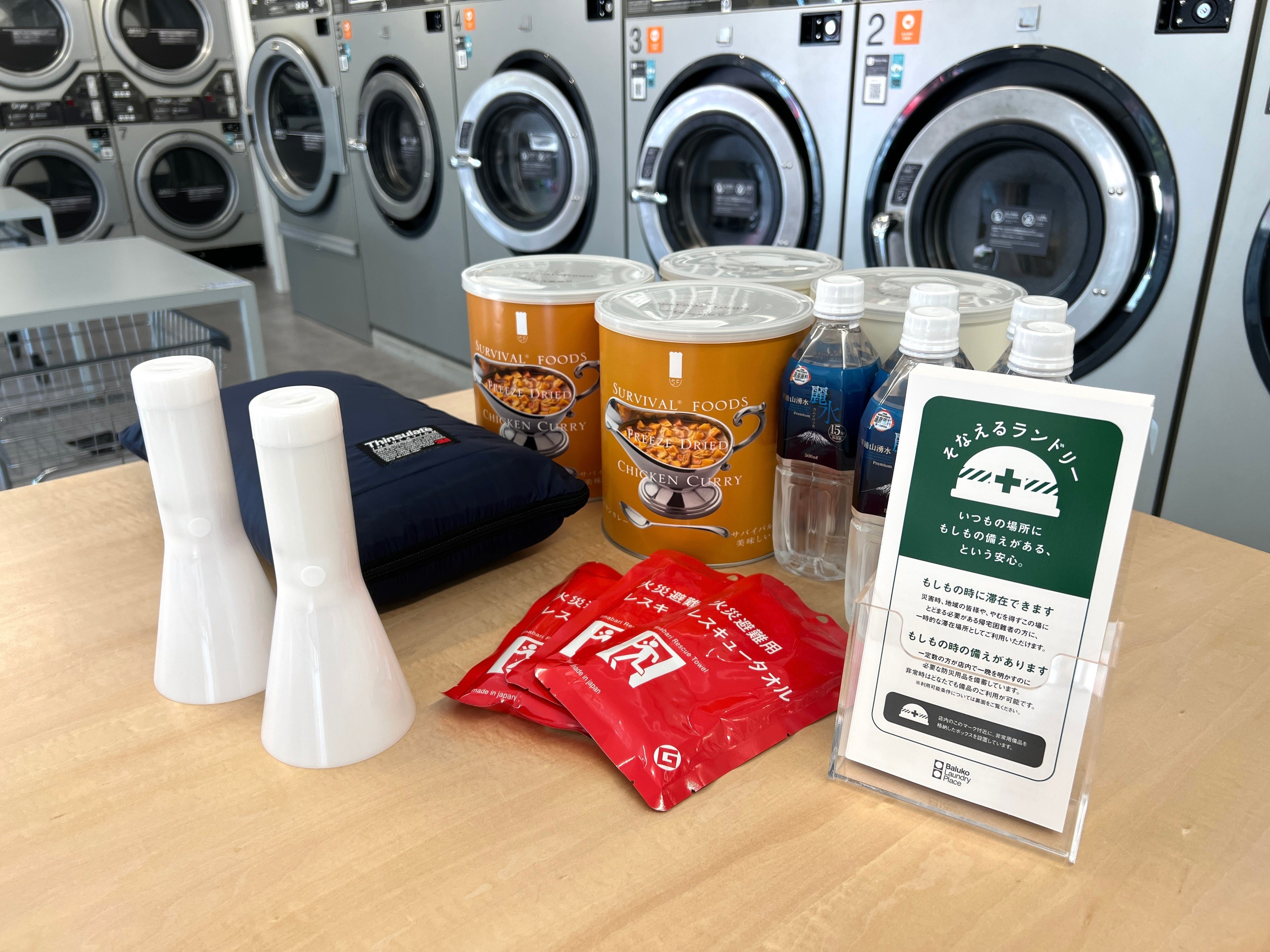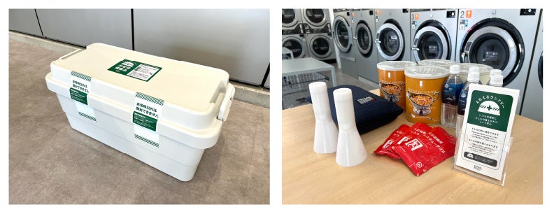 「そなえるランドリー」の導入店舗では、一定数の方が店内で一晩を明かすのに必要な非常用備蓄品を店内に常備しています。災害時にはランドリーの利用有無にかかわらず、備蓄品や滞在場所を必要とされている方であればどなたでもご利用が可能です。