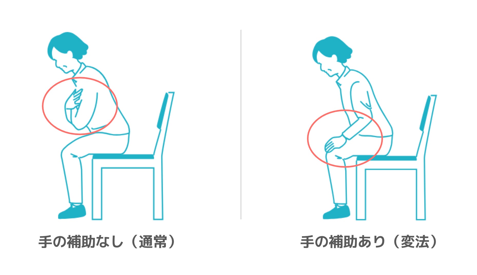 通常の5回立ち座りテストは、手の補助なし(胸の前で腕を組んだ状態)で実施します。しかし、手の補助なしの場合、実施できる高齢者の方は限定されてしまいます。そこでモーションAIでは多くの高齢者の方を評価できるよう「手の補助あり」でも評価できる設計にしています。