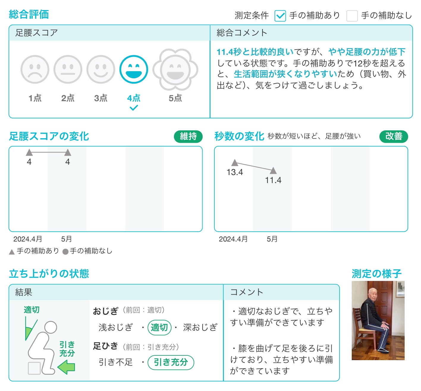 「5回立ち座りテスト」では、5回の立ち座り動作を行います。しかし、一部の方々は5回を完了することが難しい場合があります(0〜4回で終了することもあります)。モーションAIでは、こうした場合でも問題なくご利用いただけます。その結果も適切に考慮した上で、フィードバックシートや運動プログラムを提供します。