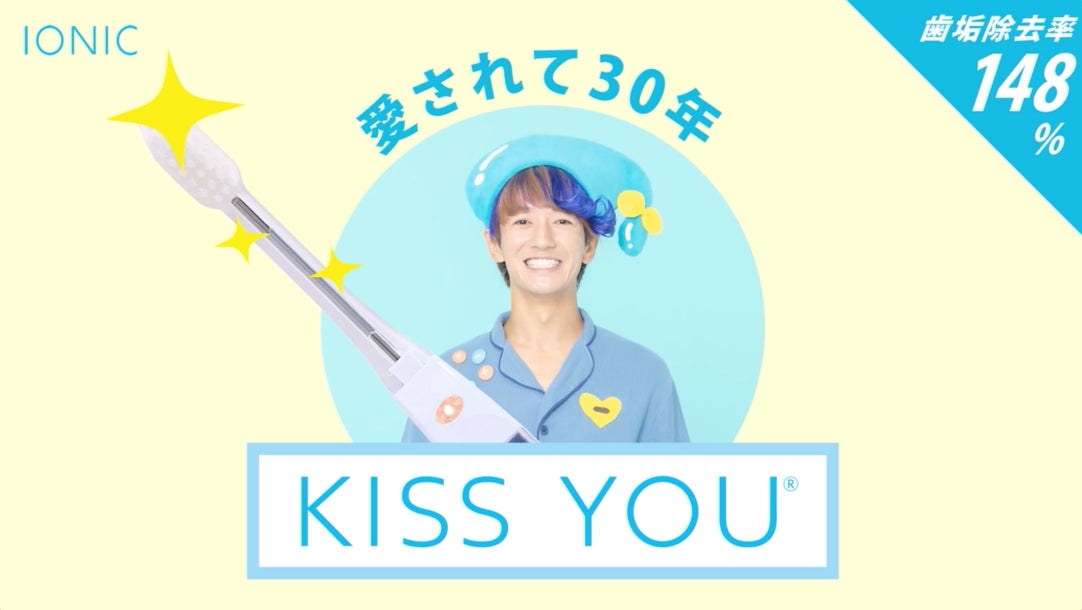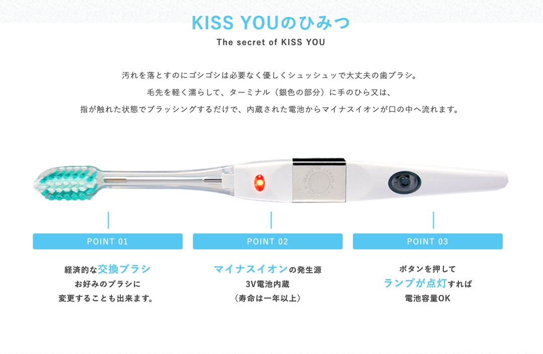 イオン歯ブラシ「KISS YOU(キスユー)」はマイナスイオンの⼒で、歯と⻭垢の結合を「ゆるめて」くれる歯ブラシです。歯ブラシに内蔵されたリチウム電池から微弱電流(マイナスイオン)を発⽣させることで歯に付着した⻭垢を効率的に取り除く歯ブラシです。愛され続けて30年以上、累計販売本数は3億本を超えるロングセラー商品です。