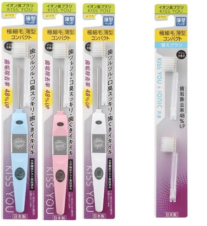 オーラルケア市場の歯ブラシカテゴリーのトレンドである「薄型ヘッド」がイオン歯ブラシ「KISS YOU」から2023年8月21日より発売。従来の「極細コンパクト」ヘッドの厚みを4.5mから3.0mmに大型改良し、「KISS YOU 薄型極細コンパクト」として新登場しました。奥歯の奥まで届くブラシヘッドで、マイナスイオンの効果と合わせて歯周病予防に最適な歯ブラシです。お口の小さい女性だけでなく、お子様や細かく歯磨きをしたい方におすすめです。便利な替えブラシはイオン歯ブラシ本体をお持ちの場合、付け替えてご使用いただけます。