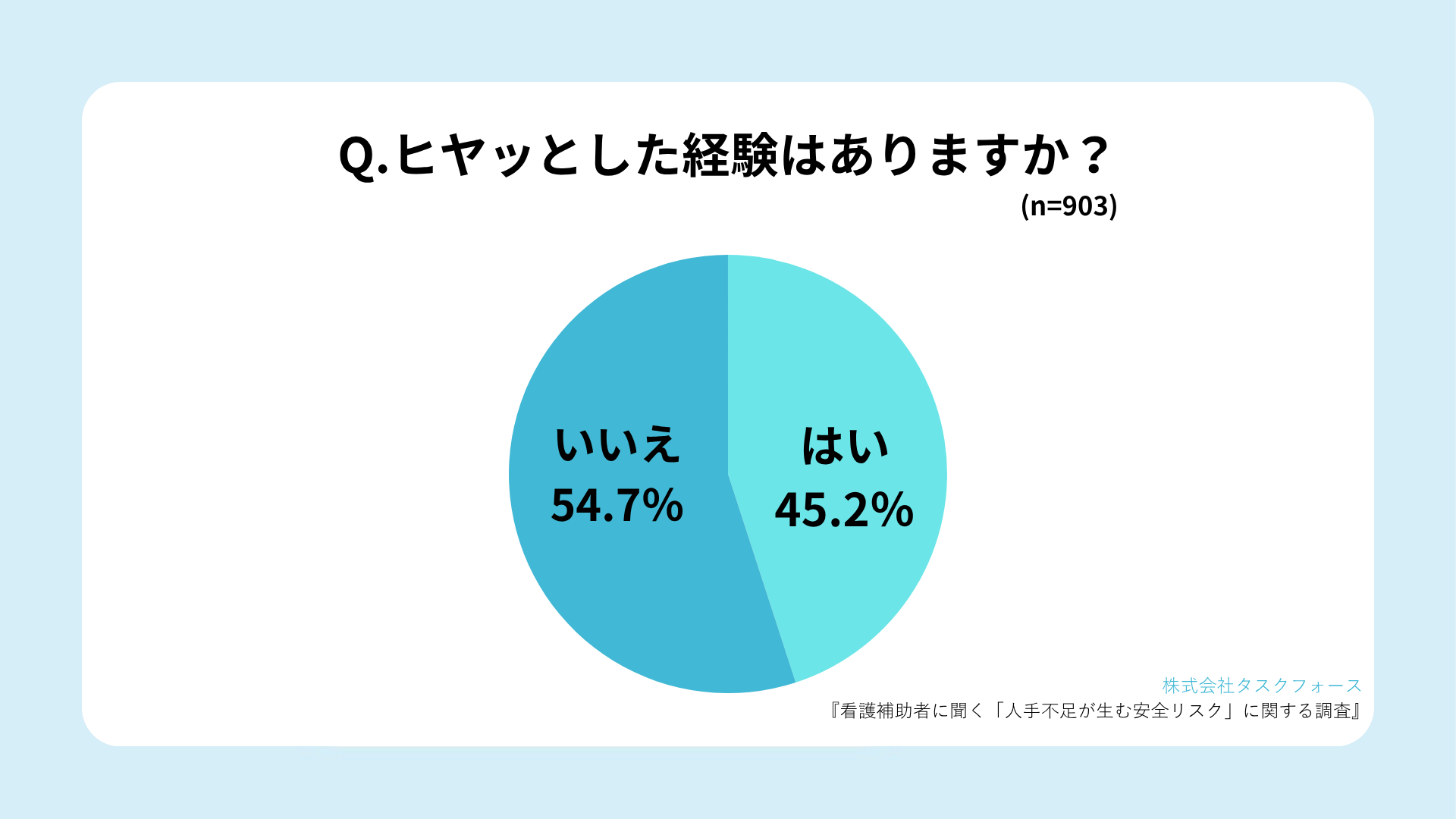 株式会社メンタルヘルステクノロジーズ(所在地:東京都港区、代表取締役社長:刀禰真之介、証券コード:9218)のグループ会社であり、医療機関向けに看護補助者を中心に人材サービスを提供する、株式会社タスクフォース(所在地:大阪府大阪市、代表取締役社長:鳴川光平)は、看護補助者を対象に、医療現場の安全リスクに関するアンケート調査を実施しました。本調査は、人手不足が課題となっている医療現場で、実際にどのような問題が起きているのかを明らかにすることを目的としています。調査結果からは、医療現場において、約半数である45.2%の看護補助者が「ヒヤッとした経験」をしていることが判明しました。また、ヒヤッとした経験の内容として、人手不足が要因となるケースが確認でき、人手不足によって実際に危険を感じる場面が生じていることが明らかになりました。