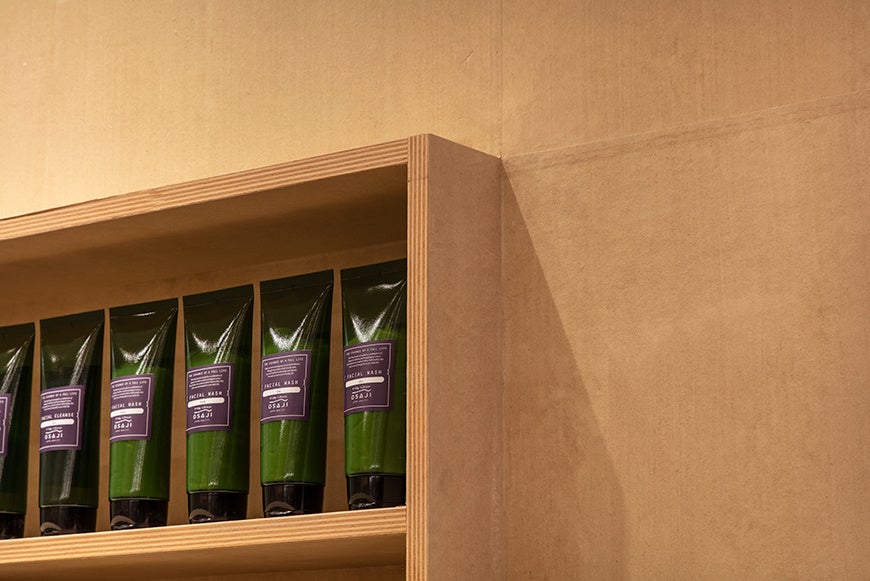 そんな店舗空間は、OSAJIらしく日本の色・質感・光を伴った空間となるように、和紙で包まれ、漆が塗り重ねられた天板が置かれ、視覚ではなく肌で商品を感じてもらえるように落ち着いた光が設定されています。そうして生まれた空間には、華美なところはなく家のように落ち着いた居心地の良さがあり、そこに佇む自分に合った商品を迎えに来ているように感じる場所になったと思っています。