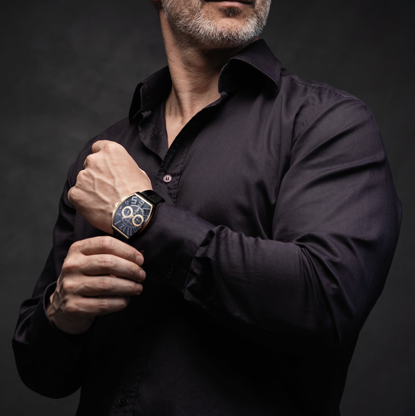 最新のストリートスタイルから洗練されたスーツスタイルまで、幅広いコーディネートに合わせやすいのがブラック。文字盤とベゼルの一部、リューズとボタンにイエローゴールドを採用することで力強いコントラストを生み出し、キラキラと光を反射するクルー・ド・パリとともにラグジュアリーな雰囲気を高めます。