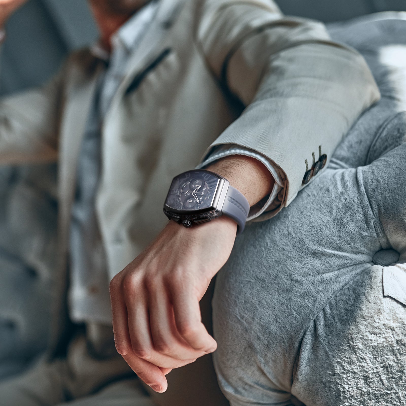 半透明で淡いグレーのシリコンストラップと深みのあるグレーのナイロンケース、さらに文字盤にはマザー・オブ・パールという異素材コンビネーションを、同系色でまとめることで奥行きを感じさせるデザインが特徴です。スーツやジャケットを軸としたドレススタイルと絶妙なマッチングを適え、大人の遊び心を主張します。