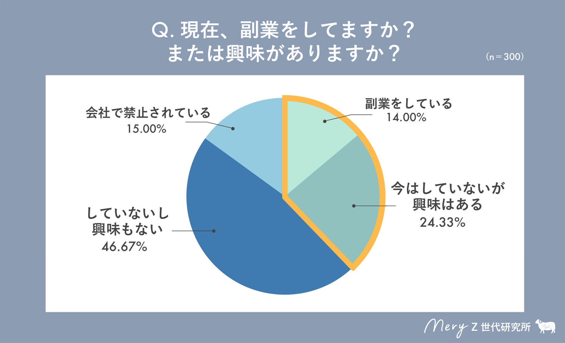Z世代300名に副業についてのアンケートを行ったところ、14%が「現在副業をしている」と回答。