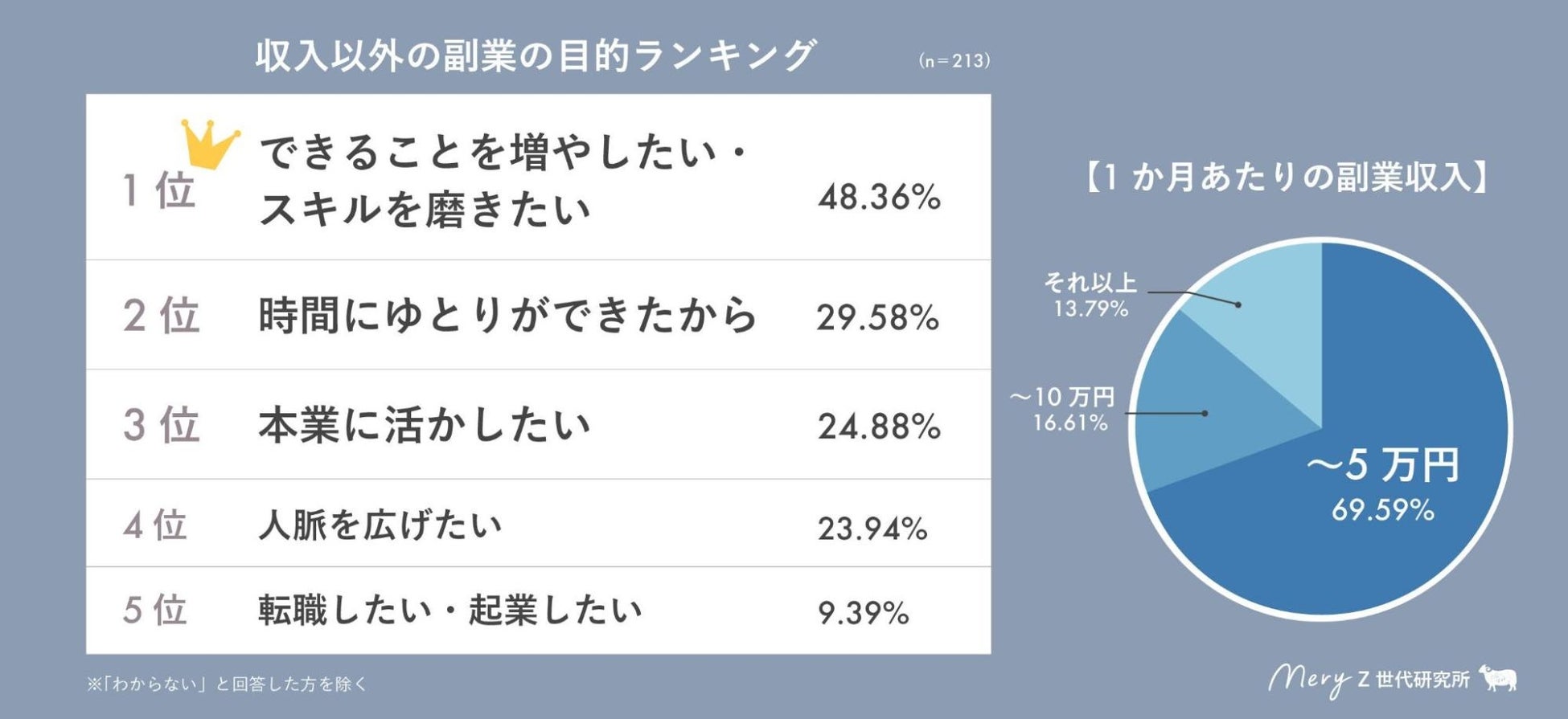 Z世代の多くは何かしら「収入以外の目的」を持って副業をしており、副業の月収に関しては「〜5万円」が約7割を占める結果となった。