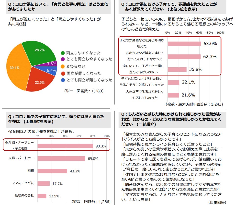 <コロナ禍で働く父母への仕事・育児・家事 実態アンケート> 「子どもと一緒にいるのに 一緒にいられない」“在宅勤務ギルト” (罪悪感) もっとも多くのパパママが「頼れる場所=保育園」と回答